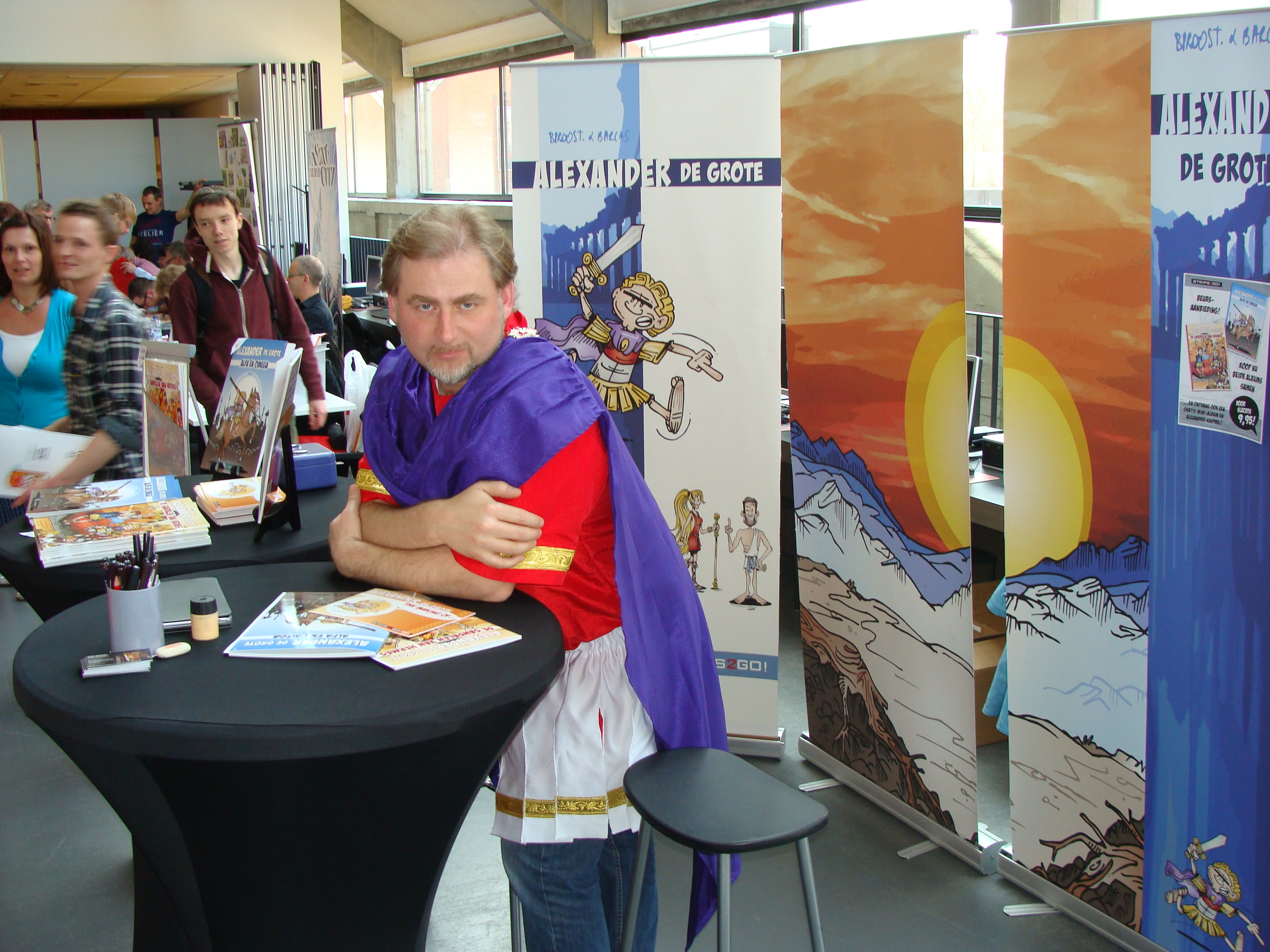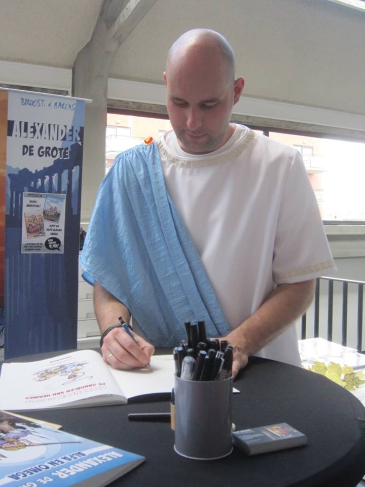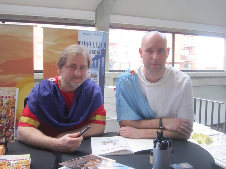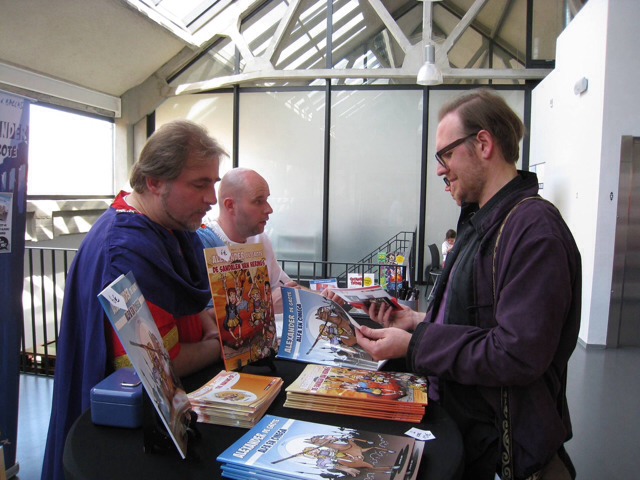 Naar aloude traditie waren we uitgedost in onze semi-authentieke pakjes à la Alexander & Aristoteles en dit tegen een kleurrijke achtergrond van mooie roll-up-banners en sfeerrijke signeertafeltjes. Bovendien had uitgeverij Strips2Go weer gezorgd voor de nodige handelswaar: albums, mini-boekjes, knipvellen, kleurplaten, enz… Voor de kinderen hadden we zelfs een eigen kinderhoekje & knutseltafeltje bij…