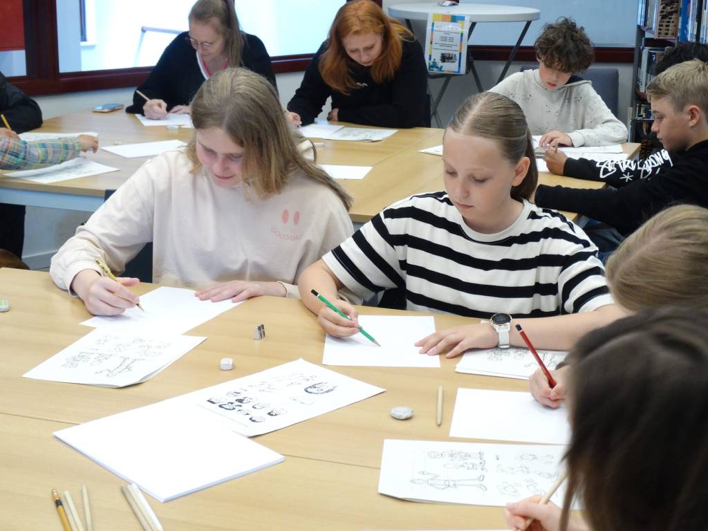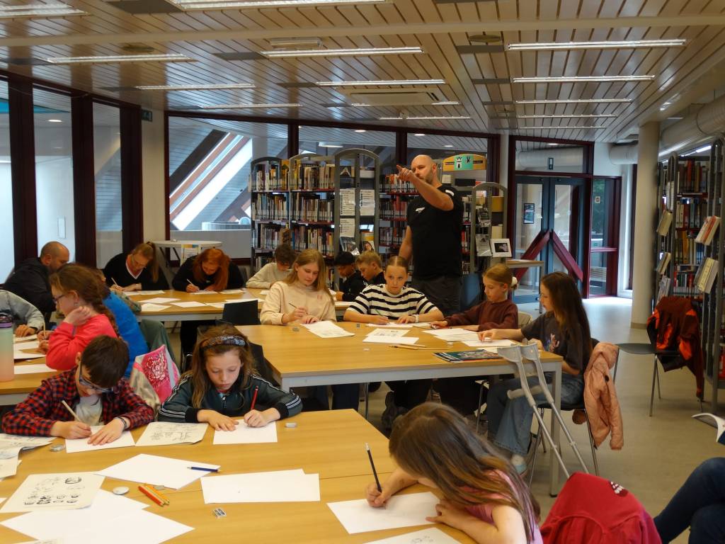 Eerst een bomvolle workshop ‘strips tekenen’ gegeven voor een héél enthousiaste groep (jonge en iets minder jonge) kunstenaars-in-spe. Dit blijft zo tof om te doen!