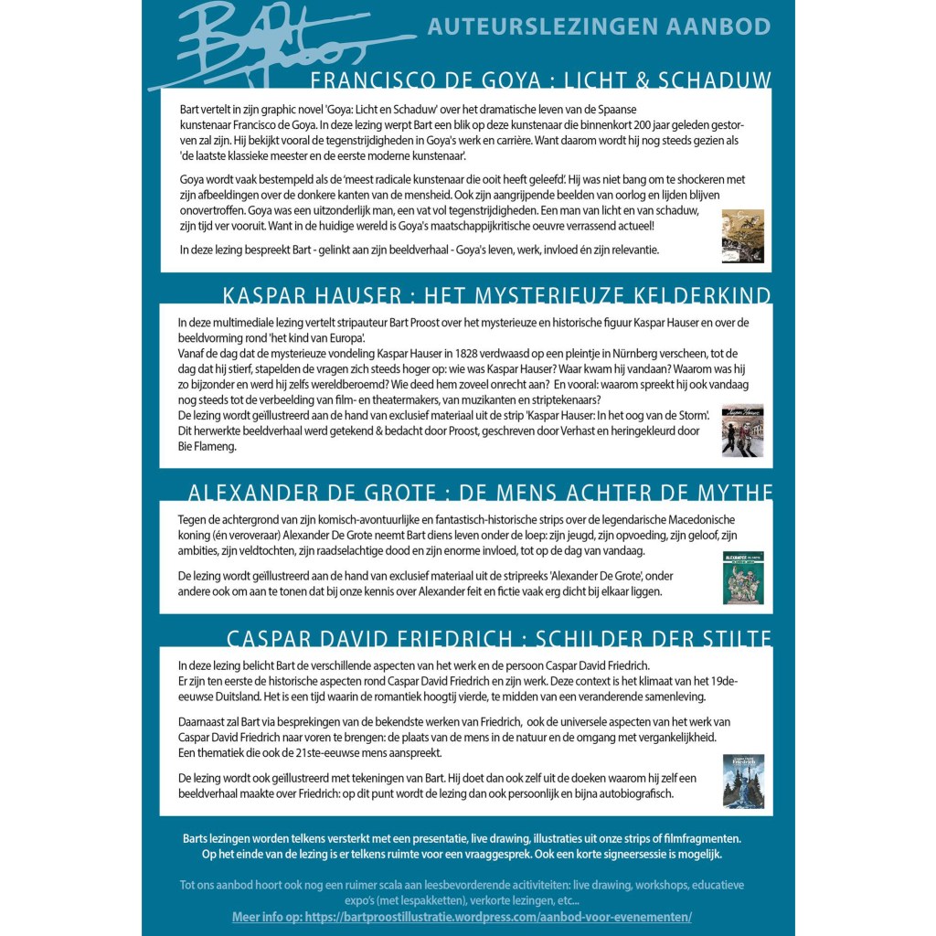 Als auteur van meerdere biografische graphic novels over kunst en cultuur, zet ik heel erg in op lezingen rond deze verhalen: over het leven en werk van dé bekendste Duitse kunstschilder Caspar David Friedrich , maar ook over het onopgeloste mysterie van kelderkind Kaspar Hauser (alias Het Kind van Europa).Of over de biografie van de Spaanse radicale kunstenaar Francisco de Goya: Goya : Licht & Schaduw.